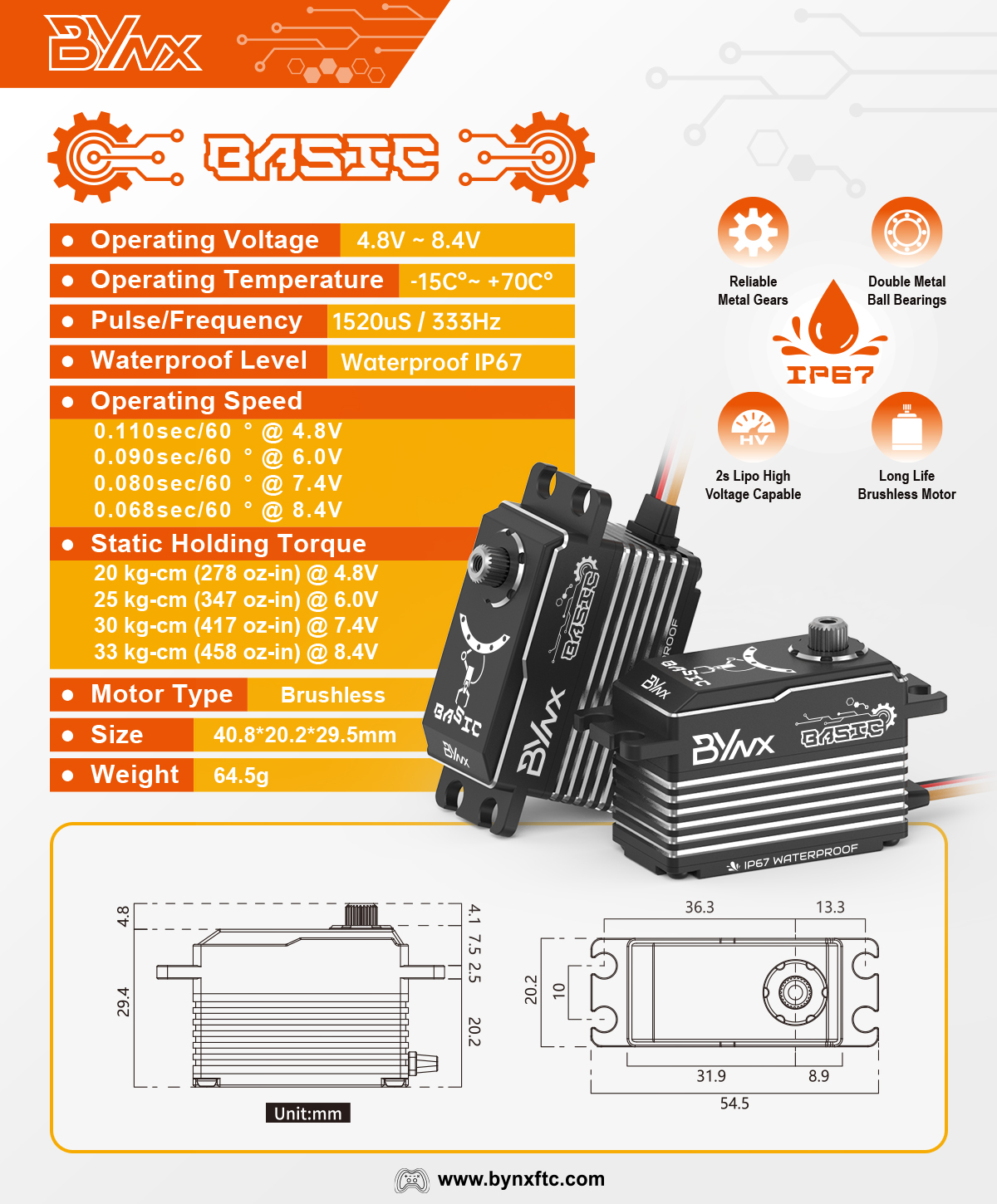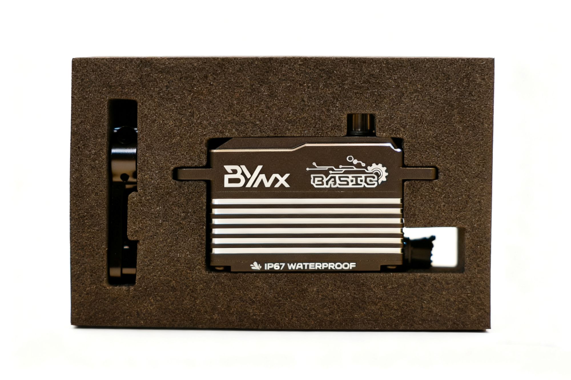 BYNX Basic 作为CR舵机,配备高效无刷电机、热处理不锈钢变速箱,锻铝外壳以及以及独特的位置反馈线,将 7.5 瓦的输出功率融入一个比标准尺寸伺服器短 10 毫米的耐用封装中